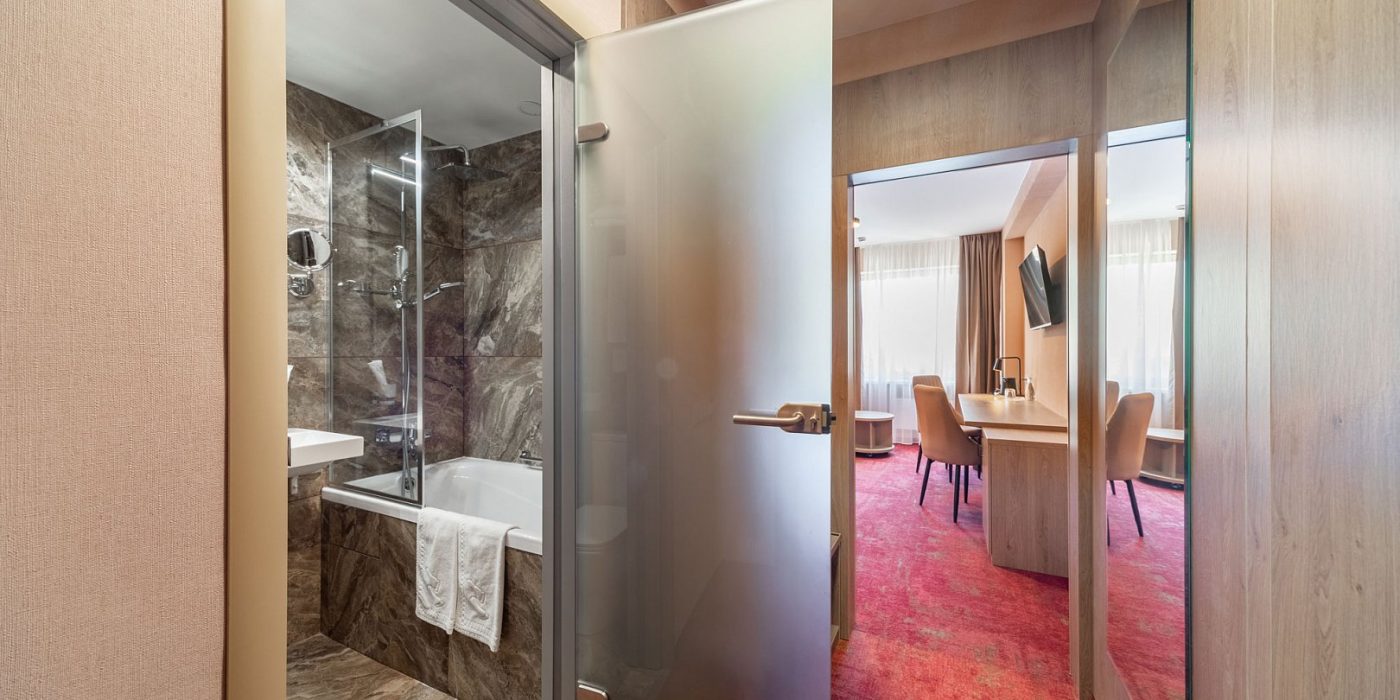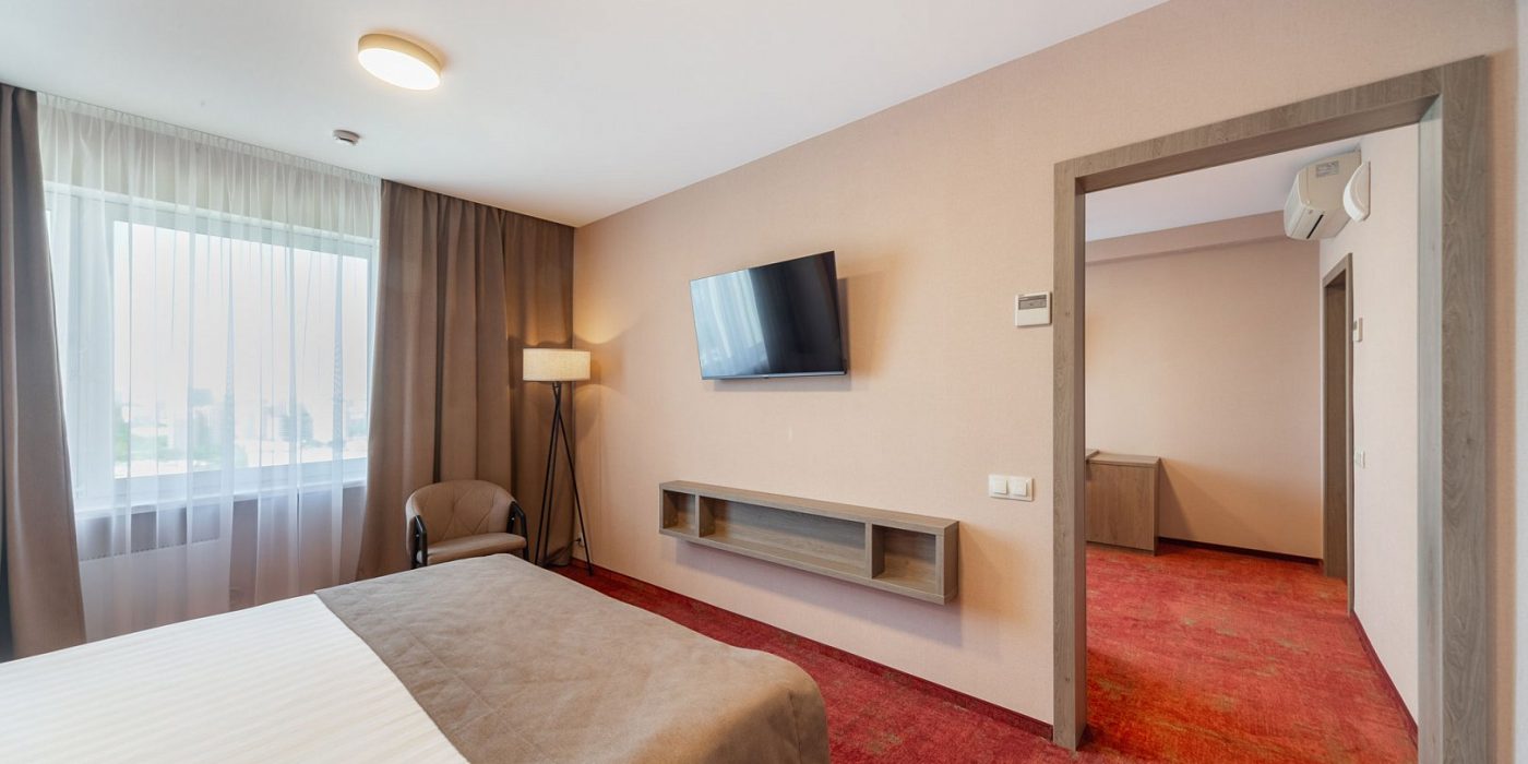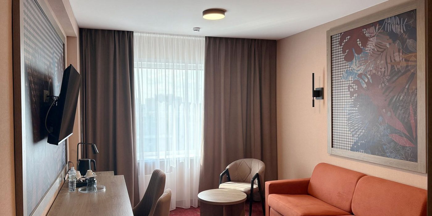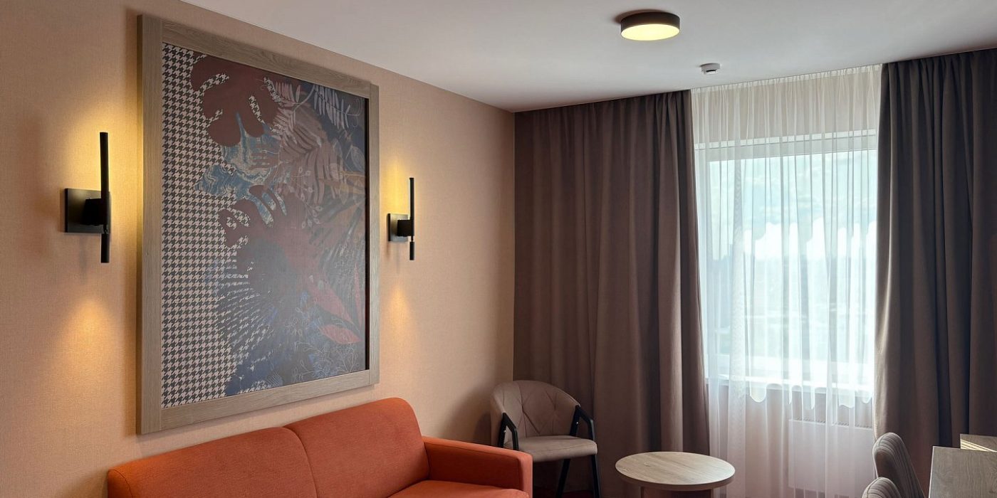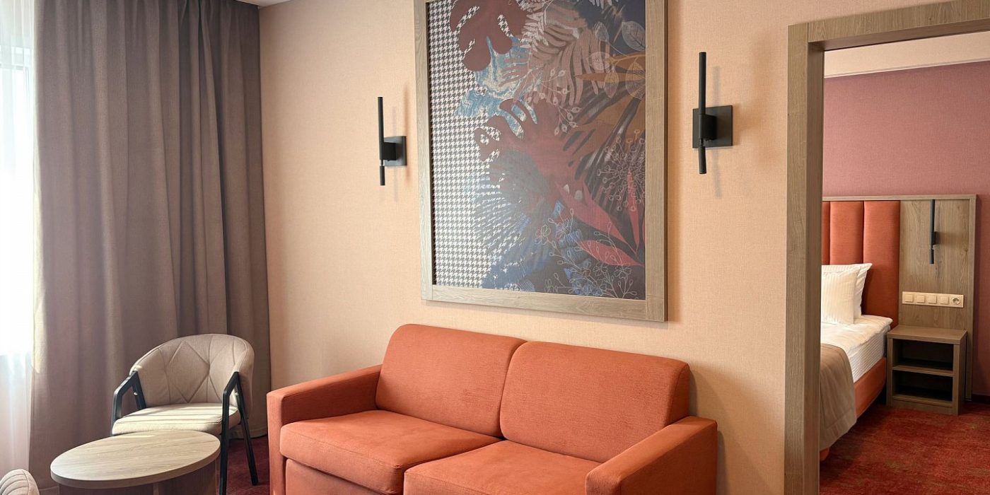 Просторный двухкомнатный номер категории «Люкс» после полной реновации порадует гостей сочетанием функционального современного оснащения и уютной обстановкой в теплых тонах.